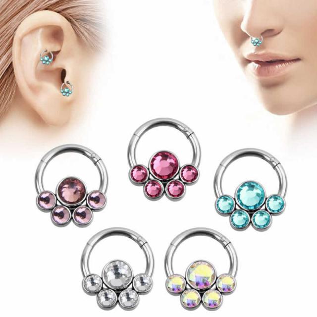 肉球のように5つのジルコニアをヒンジ付きの16ゲージのセグメントクリッカーにセットしたシンプル綺麗な軟骨用ボディーピアス。