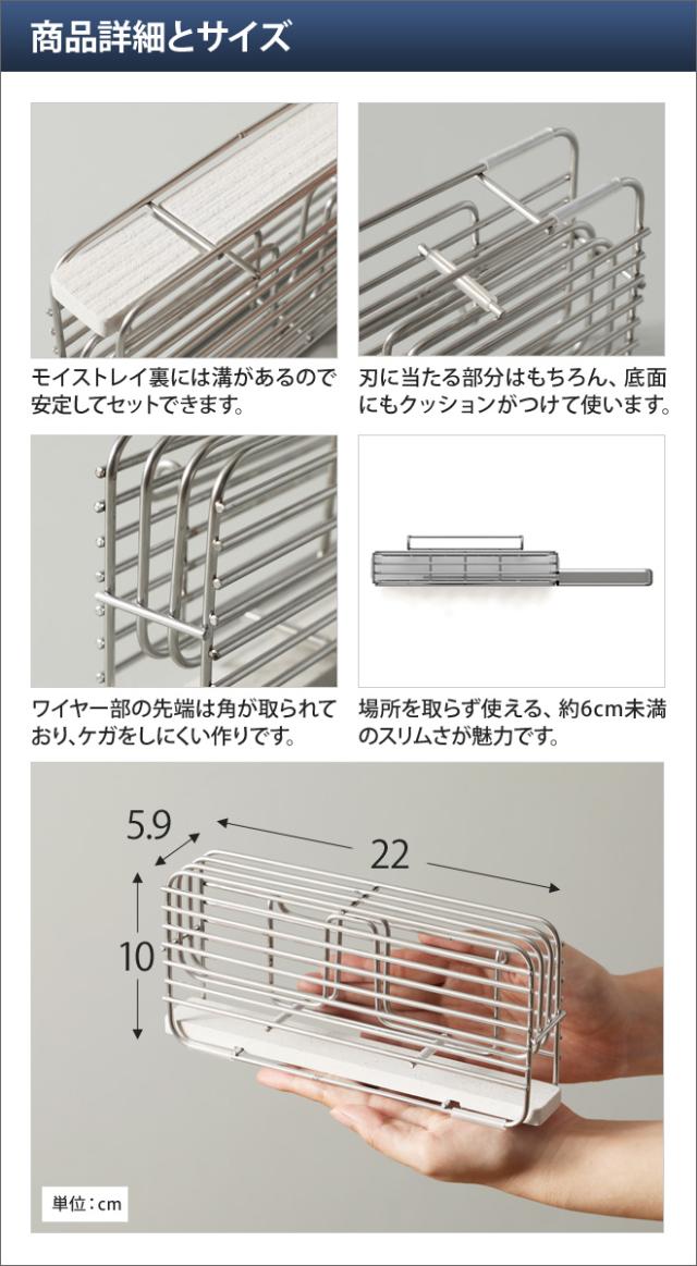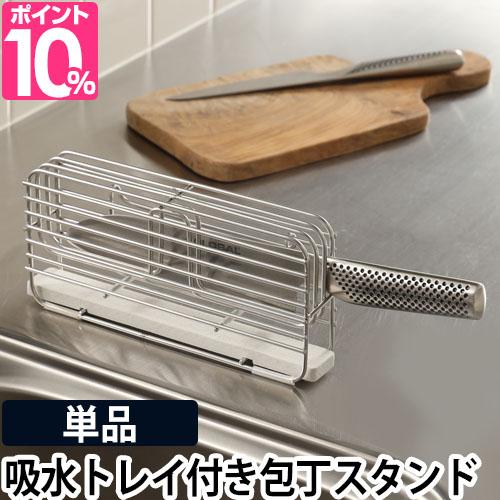 水滴を吸収するモイストレイが付いた、コンパクトな包丁スタンド。同シリーズの水切りラックに取り付けできます。