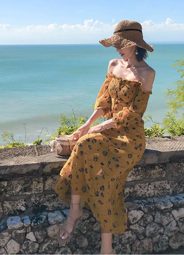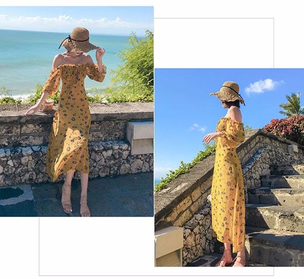 【送料無料】オフショルダー ワンピース 脚長効果 ボヘミア風 背中開き イエロー マキシワンピース 袖付き 夏ワンピ ビーチ 海デート 大人可愛い