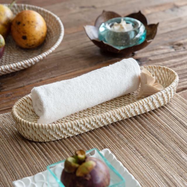 トレイ おしぼりトレー ラタン製 ホワイトウォッシュ 楕円形 デコレーショントレイ ラタンバスケット 小物入れ モダン シンプル BOHO ハワイアン
