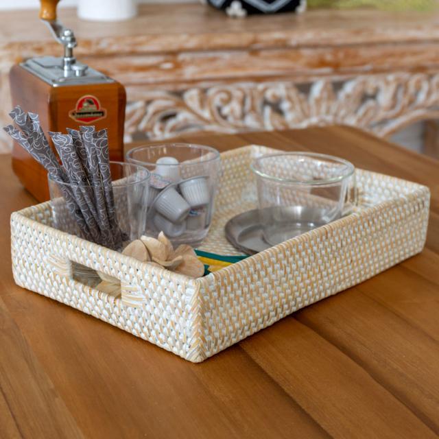 収納バスケット お盆 トレー ラタン製 ホワイトウォッシュ スクエア形 デコレーショントレイ ラタンバスケット 持ち手付き モダン シンプル