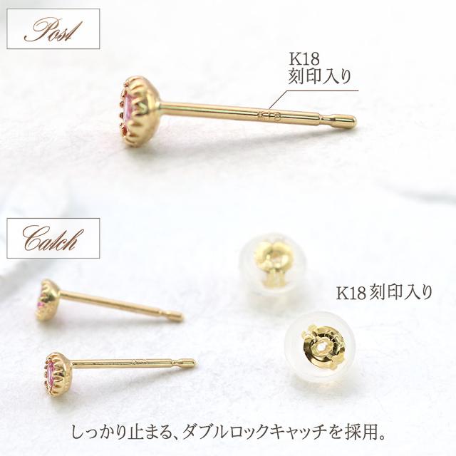| 地金・素材 | ・ピンクサファイア(ビルマ産) トータル0.1ct ラウンドカット(品質保証書付き) ・地金:K18YG(18金イエローゴールド) ・ダブルロック キャッチ |