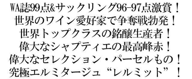 ![]() エルミタージュ レルミット 2016年 M.シャプティエ ■ ぶどう品種:シラー種100% ■ 平均樹齢:80年 エルミタージュの丘の頂上付近のシャペルの周囲に広がる日当たりの良い斜面、区画毎ごとに細分化された単一畑でビオディナミ農法で栽培される樹齢驚異の80年以上の古樹シラー100%を手摘み100%で造られます。 醸造家自ら最低でも35〜60年、うまく行けば50年〜75年キープできると絶賛する、ずばり最高峰ワインと言う名にふさわしい逸品中の逸品!テロワール自身に語らせ、テロワールの写真を撮るようにワイン造りを行う。そしてM.シャプティエの哲学ともいえる Fac & Spera 「人事を尽くして天命を待つ」を貫いた究極フルボディ辛口赤ワイン! ![]() |
