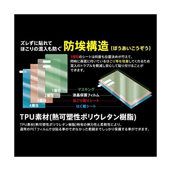 | 商品の説明 | ズレずに貼れてほこりの混入も防ぎます。 229gの鉄球を130cmの高さから落としても割れない特有の弾力性と柔軟性により、通常のPETフィルムでは貼る事のできなかった画面の端までしっかり保護します。 |