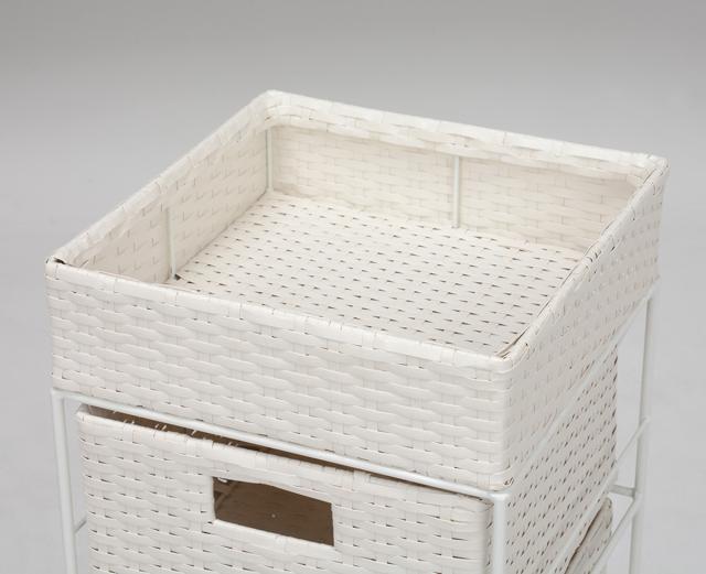 水に強い樹脂素材を編み込んだラタン調のデザインで、通気性に優れています。サッと拭き上げるだけで簡単にお手入れができるので、水回りでも活躍します。天然素材特有の節やささくれがなく、大切なお洋服やタオルを引っ掛けて傷付けにくいので安心です。