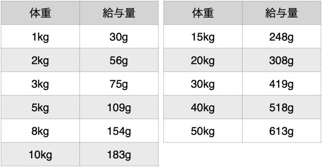 ・犬によって必要とする食事量は異なります。与え始めはこの表を参考にして、健康的な体型を維持できるよう愛犬の生活環境や年齢、活動量などを踏まえ、給与量を調整してください。