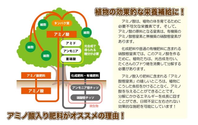 詳しくは下記の図でも紹介しておりますが、アミノ酸は植物が成長するためすぐに使える栄養素です。光合成に左右されずに成長に利用できるため、日照不足や低温時も十分な肥料効果が得られます!