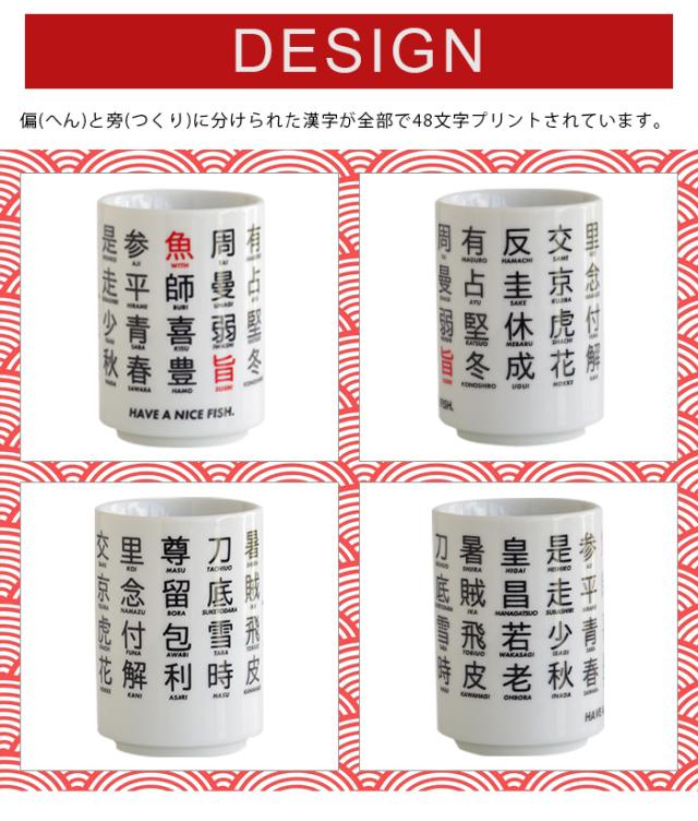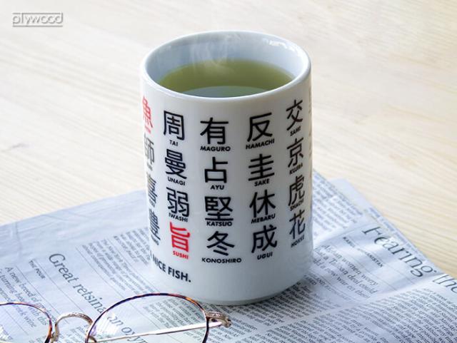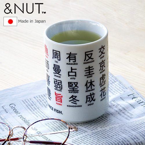 日本を代表する食べ物といえばお寿司。そんなお寿司をモチーフにしたユニークでおしゃれな湯呑みです。様々な魚の漢字を偏(へん)と旁(つくり)で分けて表し、大胆に並べたデザインでかっこよく仕上がっています。HAVE A NICE FISH(いい魚揃ってます)と言う粋なメッセージまで。色々な魚を漢字だとどうやって表すのか見て楽しみながらお茶なんかを飲むのもいいですね。&NUTらしく斬新なデザインのこちらの湯呑み、和な雰囲気を残しつつも現代的なデザインになっていて外国人の方々にも受けること間違いなし。外国人の友達なんかにお土産として渡しても喜ばれるのではないでしょうか。また丁寧に作られたこちらの湯呑み、品質も安心の日本製です。
