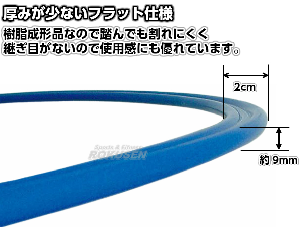 フラットフープは通常の体操リングと違い、厚みが少なく、樹脂成形品のため踏んでも割れにくいといった特徴を持っています。