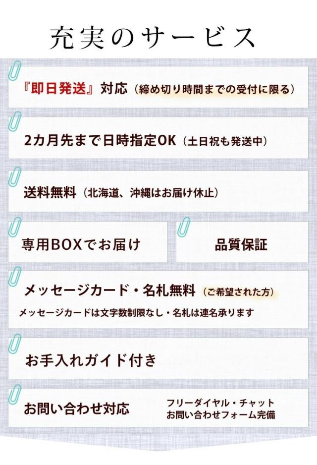 ご希望のお客様にはメッセージカード/お取り扱い説明書/品質保証付リーフレット