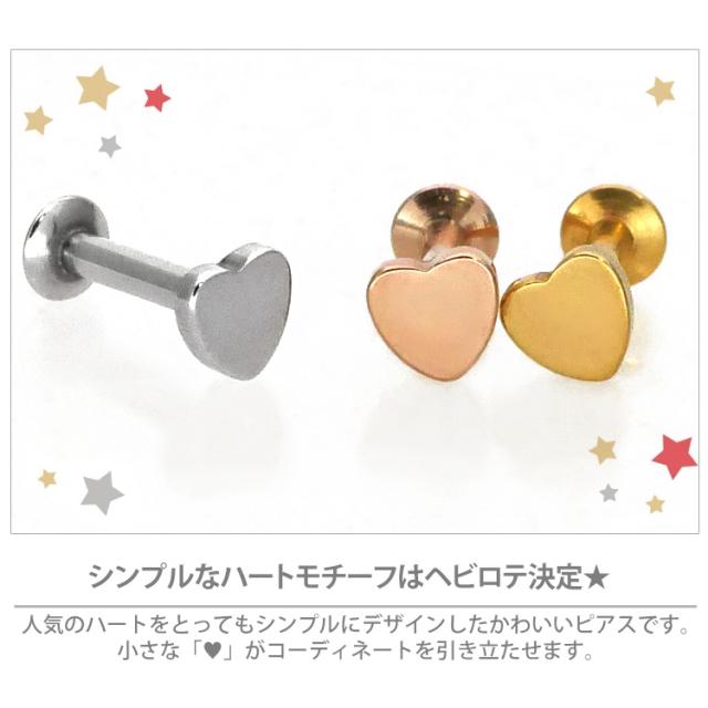 インターナルラブレットに女性に人気のスターモチーフをプラスした、とってもキュートなボディピアスです。小さなハートがコーディネートを引き立たせます。シンプルなコーデはもちろん、重ね付けコーデもぴったりですよ。 カラーはシルバー、ゴールド、ローズゴールド、ブラックと人気の4色をご用意致しました。太さは使いやすい16G。ボディピアス初心者さんにも上級者さんにもおすすめです。 ピアスの材質には、安心の医療用素材「316Lサージカルステンレス」を採用。 時間がたっても変色や変形しにくく、金属の輝きが色あせません。