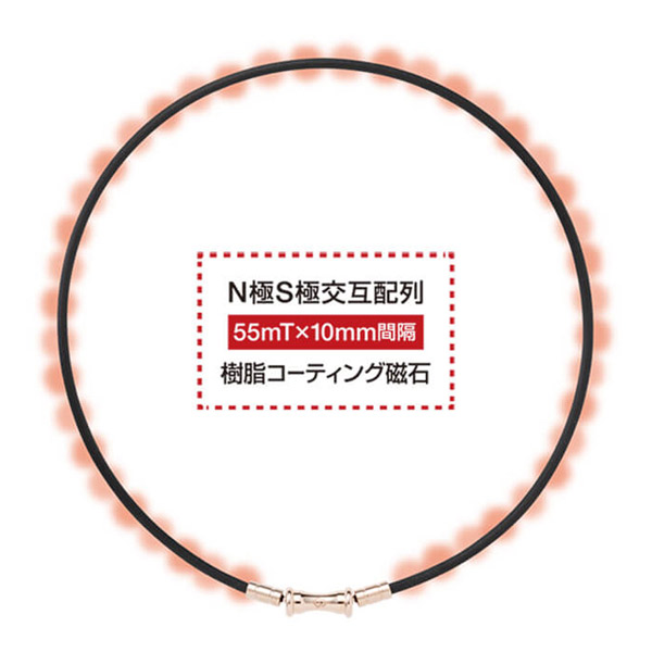 ネックループ全体には55mTの磁石がコラントッテ独自のN極S極交互配列で10mm間隔に配置されています。この配列により磁力を広範囲に影響させることができ、首・肩の血行を改善、首・肩のコリを緩和します。