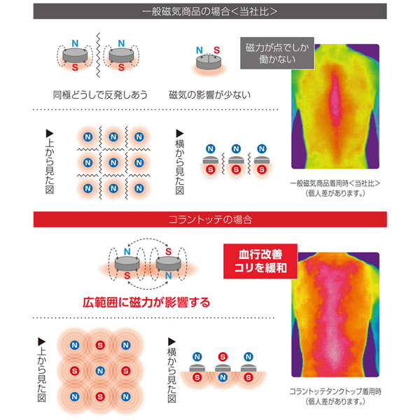コラントッテは永久磁石を、独自のN極S極交互配列で配置した医療機器です。また、独自のN極S極交互配列によって磁力を広範囲に影響させることができます。