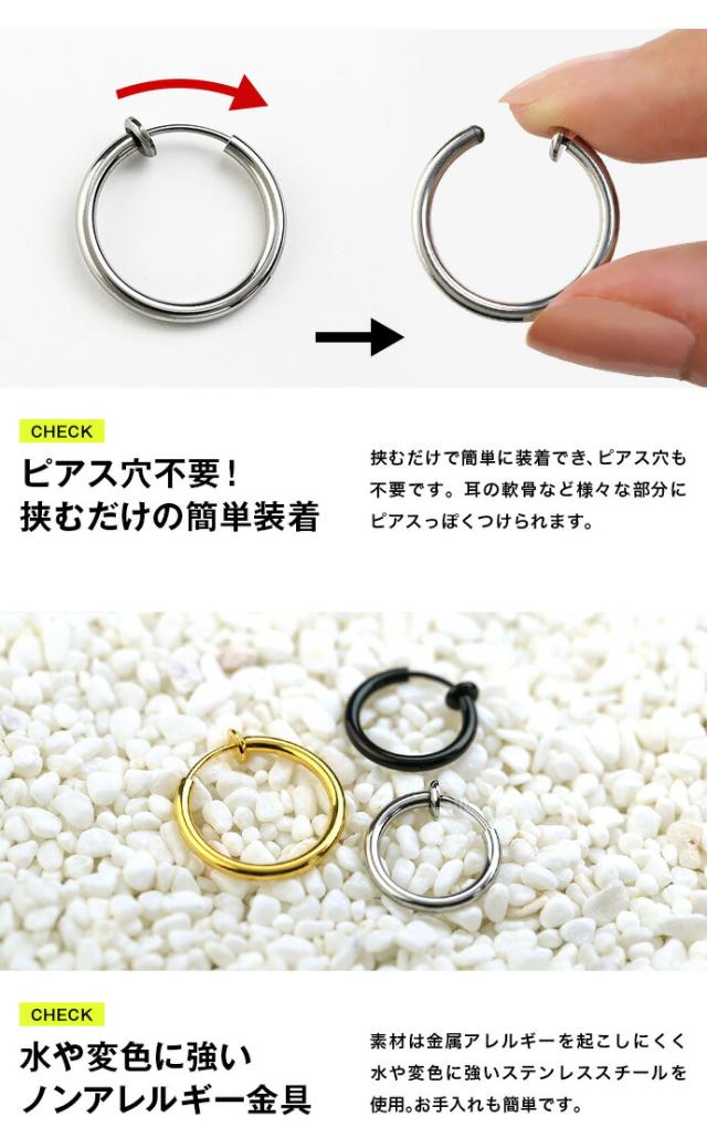 挟むだけでピアスをしているように見える、ピアス穴がいらないフェイクピアスです。素材は金属アレルギーを起こしにくく、水や変色に強いステンレススチールを使用。耳の軟骨など色々な部分にピアスっぽく着けていただけます。