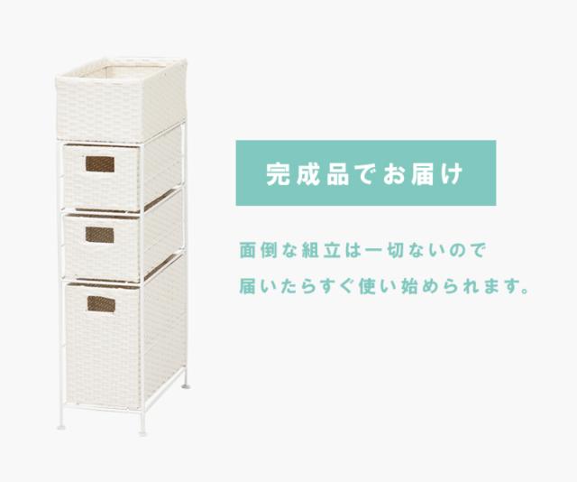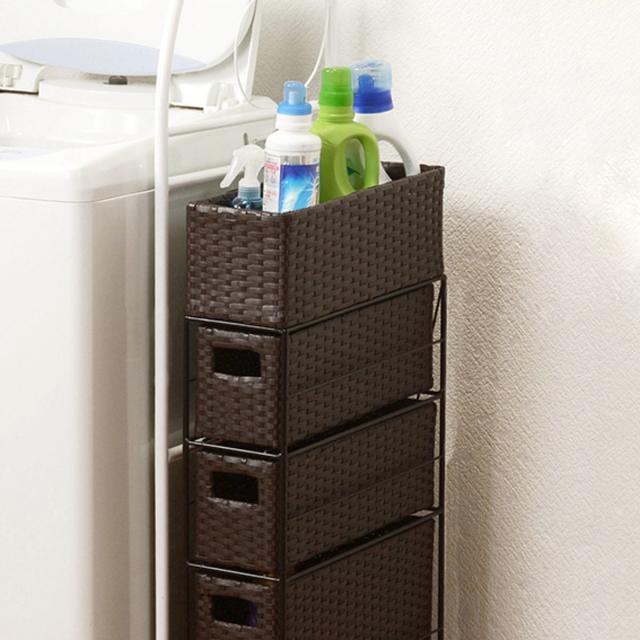 お手入れのしやすい樹脂製なので、水周りでも便利にお使いいただけます。通気性の良いラタン調のデザインで、衣類やタオルの収納にもおすすめです。
