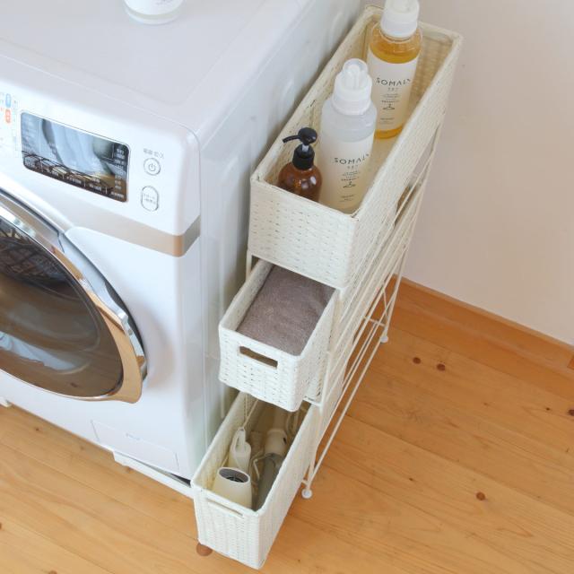 スペースの限られた洗濯機横やトイレの収納としてもちょうど良いサイズ感です。