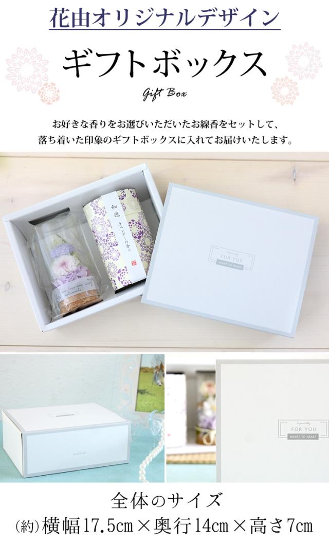 | 内容 | プリザーブド小菊、プリザーブドアジサイ、 プリザーブドグリーン、プチフラワー、その他ドライ リボン/器 ドーム:ガラス/ ご希望のお客様にはメッセージカード/お取り扱い説明書/品質保証付ショップカード ※ご覧いただいているデバイスの画面によって、実際の商品と色合いや明るさなどのイメージが異なる場合がございます。 ※入荷状況により、器のデザイン、花の色味・資材の一部が変更になる場合がございます。 【お線香】 ◆カメヤマ 和遊筒箱 線香 いずれか1つ:(桜の香り/ラベンダーの香り/しゃぼんの香り/緑茶の香り/白梅の香り/備長炭の香り/向日葵の香り/金木犀の香り/梔子の香り) 燃焼時間:約19分 内容量:約90g 小函寸法:φ63×H103mm ◆花由オリジナル専用箱 |