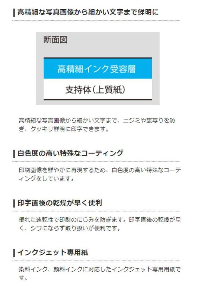細かい部分までくっきり再現できる高画質用スーパーファイン紙です。印刷画像を鮮やかに再現するため、白色度の高い特殊なコーティングをしています。高精細な写真画像から細かい文字まで、ニジミや裏写りを防ぎ、クッキリ鮮明に印字できます。カレンダーや立体POP、リーフレットなどに最適です。染料インク、顔料インクに対応したインクジェット専用用紙です。優れた速乾性で印刷のにじみを防ぎます。印字直後の乾燥が早く、シワにならず取り扱いが便利です。厚さ0.190mmのしっかりした厚みのある片面印刷用紙です。