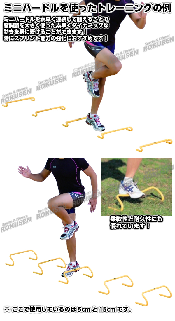 近年、スプリントドリル練習において重視されている、もも上げ動作を意識せず、地面からの反発力を意識する重心移動トレーニングに最適のミニハードルです。