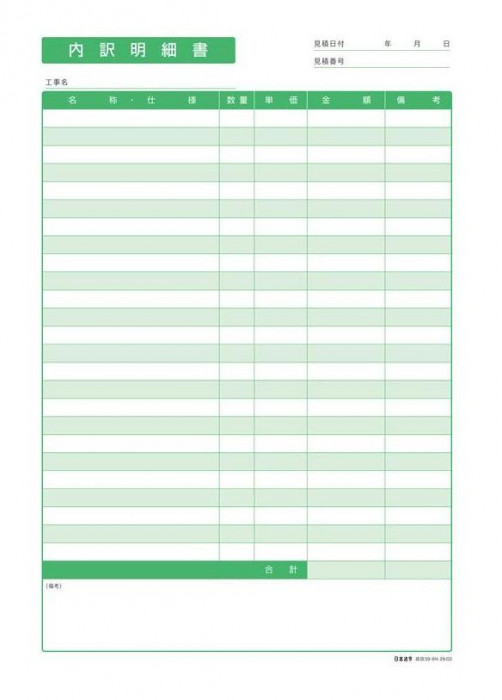 商品詳細:法定福利費内訳明示に対応しています。建設39-7N建設工事見積書とセットでご利用いただける商品です。 生産国:日本 商品サイズ:A4・タテ型 仕様:天マーブル巻 ノーカーボン2枚複写×25組表紙、本文2色カラー印刷ノーカーボン・ブラック発色