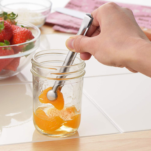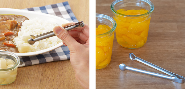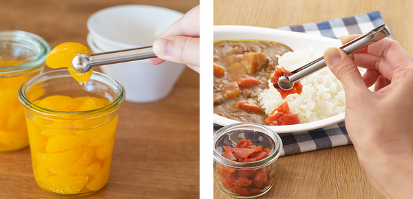 小瓶にもスッと入り取り出しやすい小瓶対応トングです。みかんや桃、キムチの瓶詰めなどから食材を取り出す際に活躍します。