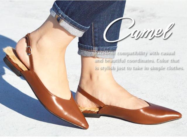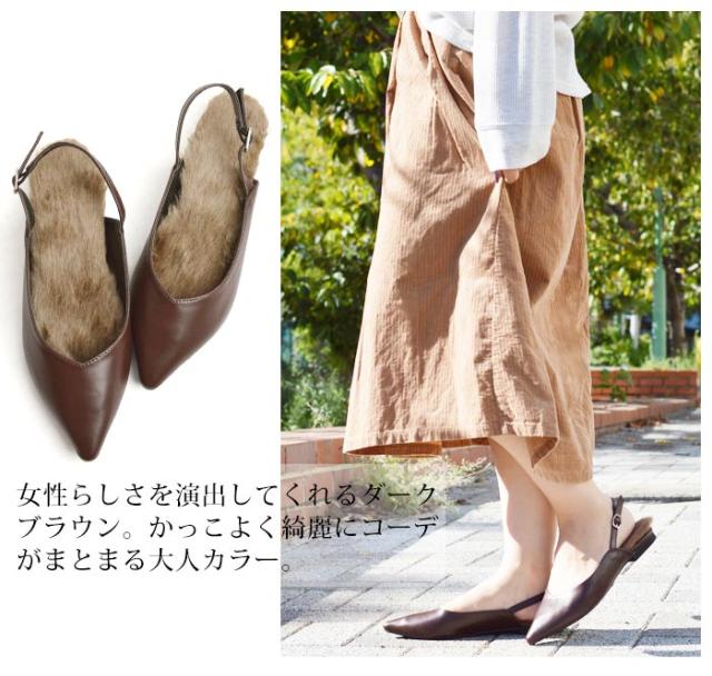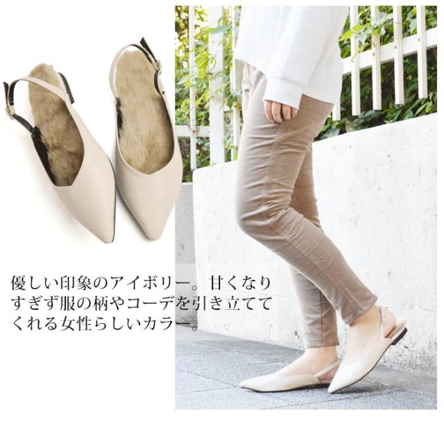 インソール部分にファーが付いたフラットパンプスが登場!ふわふわのファーで履き心地やわらか。履いた時にかかとからファーがちら見えするとっても可愛いデザインです。すらっとしたシルエットのポインテッドトゥとVカットが足元を綺麗に見せてくれます。かかと部分には細いストラップがついているので足にフィット。カジュアルにもキレイめコーデにも使えるオススメの一足です。