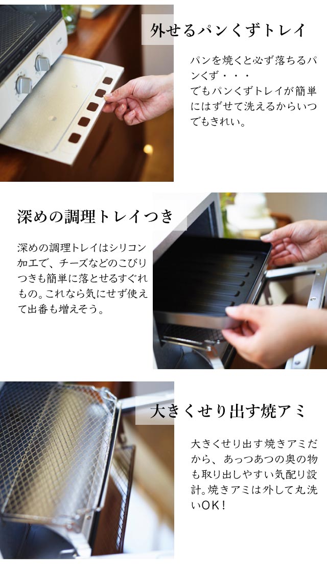 - 中の網が不安定。ずれたり浮いたりする。下の電気が近く上の電気が遠い。上下別に温度設定ができない。例えばパンの下を焦がさず上のチーズをこんがりさせようと思ったら、受け皿やアルミホイルを駆使し自分なりに調...