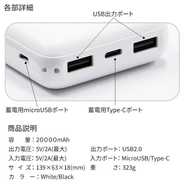 入力ポート : MicroUSB・Type-C / 出力 : USB 5V/2A(MAX)