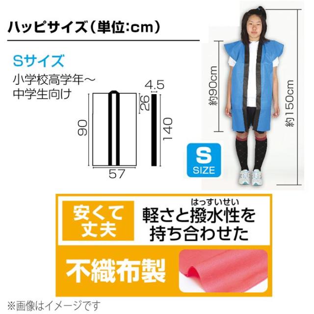 丈が長く、動きやすい。袖無しロングハッピ。ハチマキ付安くて丈夫。軽さと撥水性も持ち合わせた不織布製。子供用サイズ。小学校高学年から中学生向け。
