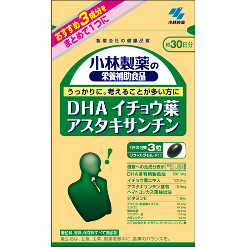【商品説明:】○うっかりに!○1度に摂れる3成分○いつまでも自立した生活を送りたい中高年に○ソフトカプセル○着色料、香料、保存料すべて無添加うっかりのためにDHA・イチョウ葉・アスタキサンチンの3成分を一粒に詰めたいつまでも自立した生活を送りたい中高年のためのサプリメント。【用法・用量:】<1日当たりの摂取量の目安>3粒【内容量:】90粒【製造販売元(会社名):】小林製薬(株)