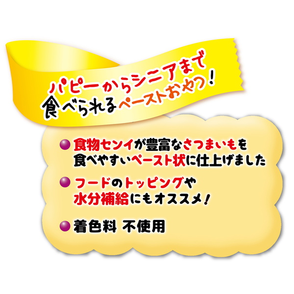 食物センイが豊富なさつまいもを食べやすいペースト状に仕上げました。フードのトッピングや水分補給にもオススメ!暑い日は凍らせてシャーベットにも!着色料不使用。着色料不使用