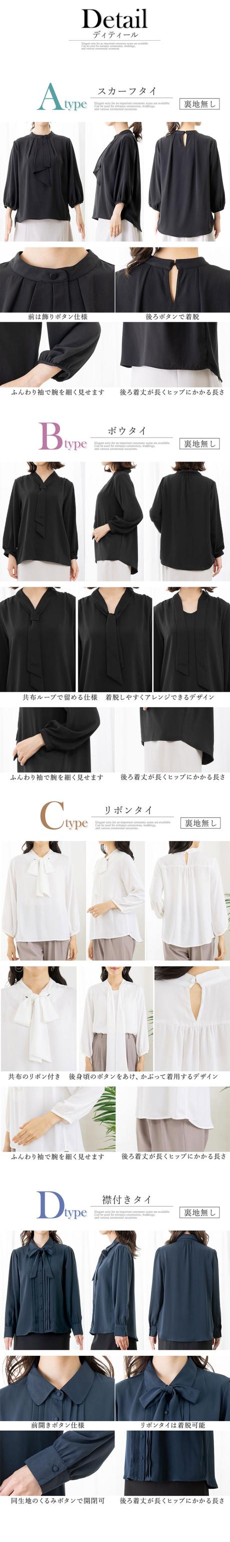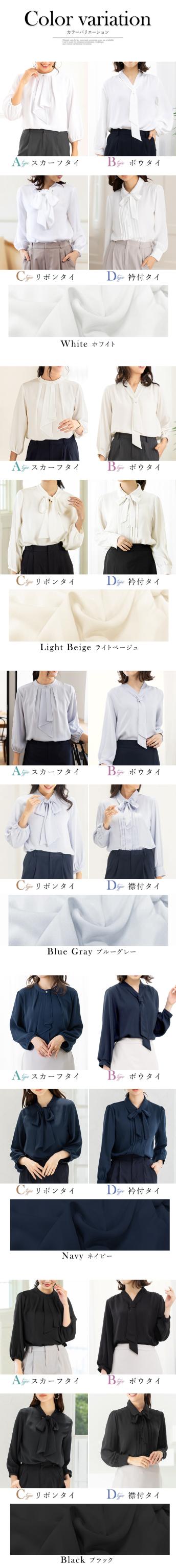 「スカーフタイ」「ボウタイ」「リボンタイ」「襟付タイ」の4種類から選べ、いずれもオフィスからセレモニーまで幅広く活躍する華やかなデザイン