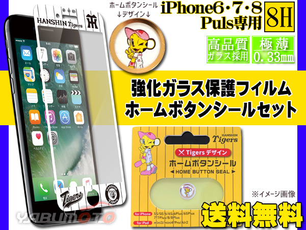 タイガース公認デザイン 強化ガラス 保護フィルム WHITE ホームボタンシール ラッキー セット iPhone6 7 8 Plus メール便 送料無料
