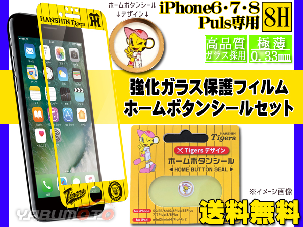 タイガース公認デザイン 強化ガラス 保護フィルム YELLOW ホームボタンシール ラッキー セット iPhone6 7 8 Plus メール便 送料無料