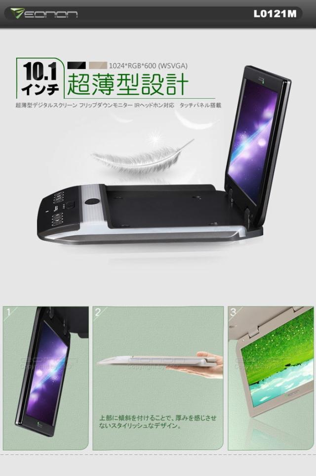 10.1インチ超薄型フリップダウンモニター WSVGA画面 バックライト付タッチパネル ブルーライト内蔵 IRヘッドホン対応 L0121/L0122
