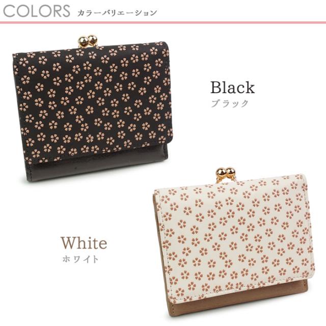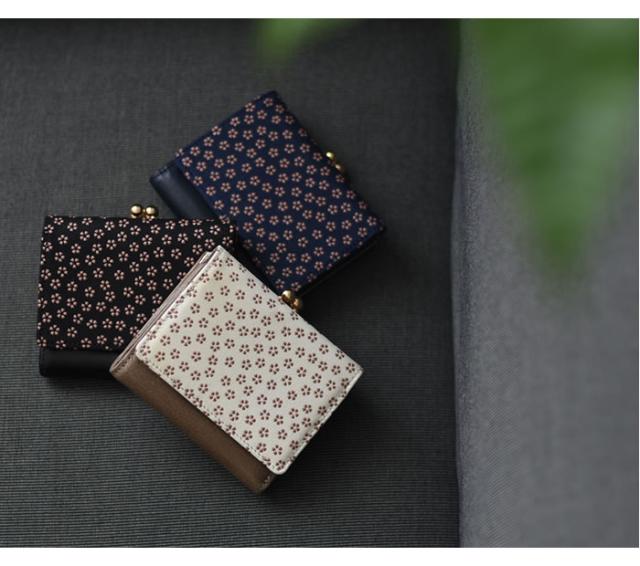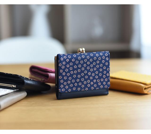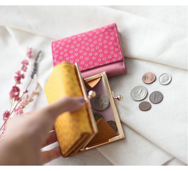 ぱちんと開く口金がアクセントのがま口三つ折り財布。