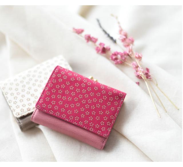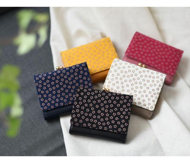 明るいカラーにモダンなデザインが魅力です。小さく舞う桜がかわいらしい古都印伝のコザクラシリーズ
