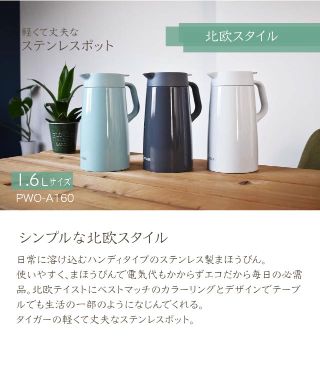 ステンレスポット ハンディポット 卓上ポット 真空断熱 1.6L タイガー 保温 保冷 魔法瓶 まほうびん北欧風 PWO-A160