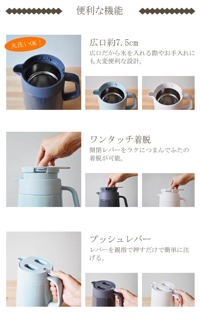 1)まほうびん構造だから電気を使わず、保温・保冷で1年中大活躍。