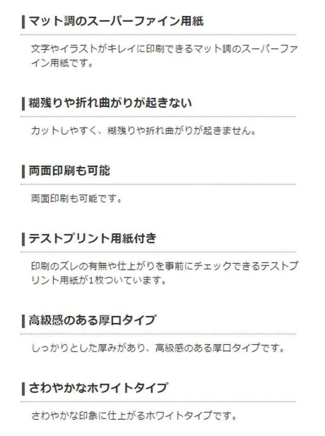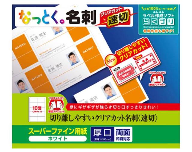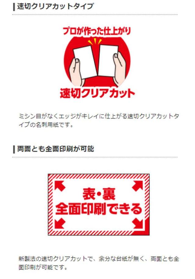 ミシン目がなくエッジがキレイに仕上がる速切クリアカットタイプの名刺用紙です。新製法の速切クリアカットで、余分な台紙が無く、両面とも全面印刷が可能です。カットしやすく、糊残りや折れ曲がりが起きません。文字やイラストがキレイに印刷できるマット調のスーパーファイン用紙です。両面印刷も可能です。印刷のズレの有無や仕上がりを事前にチェックできるテストプリント用紙が1枚付いています。しっかりとした厚みがあり、高級感のある厚口タイプです。さわやかな印象に仕上がるホワイトタイプです。