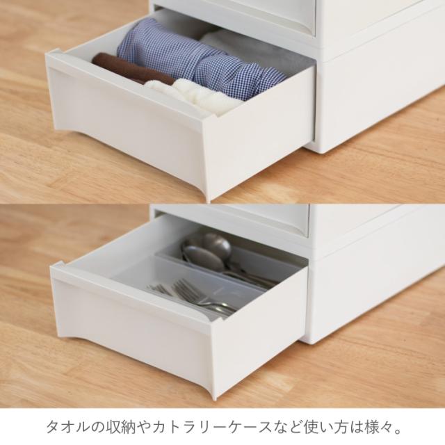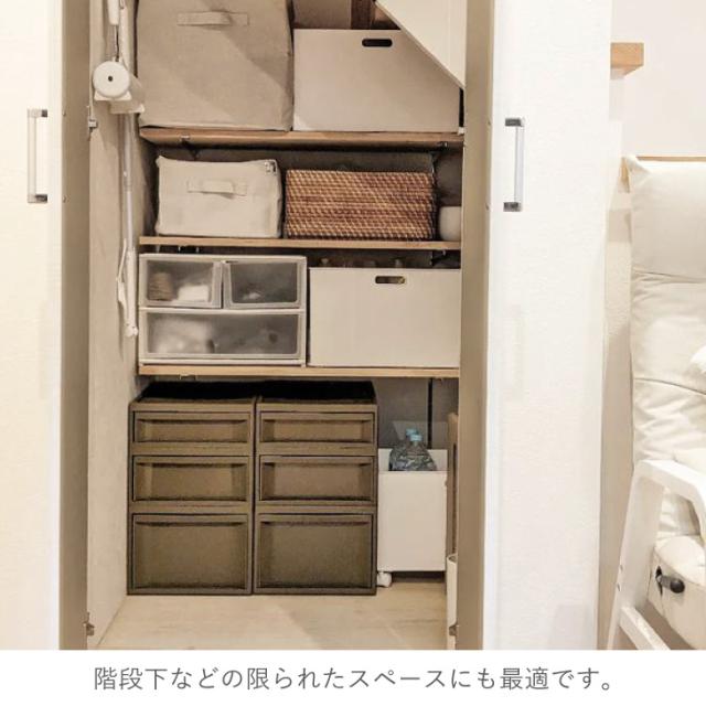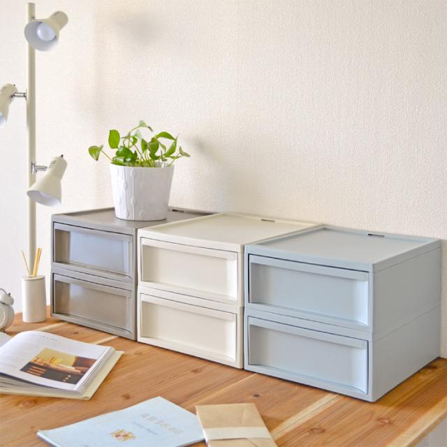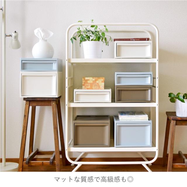 デスク・洗面所・パントリーに。 どこにでも使える万能さをもった収納ケースです。 プラスチックケースに今流行りのくすみカラーをつけてちょっとオシャレに仕上げました。 ツヤを消したマットなボディと絶妙なカラーリングは、中身が見えず生活感が抑えられるので、インテリアとしてもオススメです。さっとどこでも使いやすいA4サイズ。タオルや靴下など小物類に。一段づつ積み重ねができるスタッキングタイプで好きな段数に組み替えてご使用いただけます。引き出しには、抜け落ち防止ストッパーが付きでお子様の衣類収納や、おもちゃ箱にもオススメです。差し込むだけで使える別売のキャスターを付ければ可動式のチェストにできて、お掃除も簡単にできます。