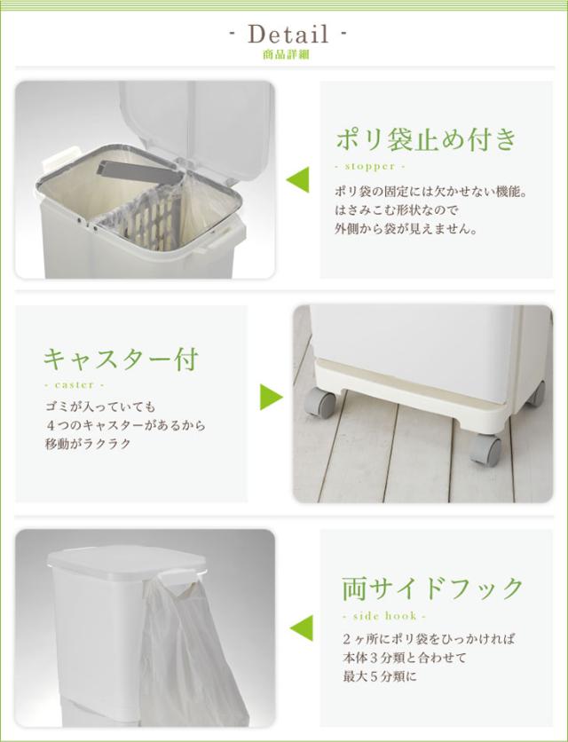 爽やかなライトグレーが特徴の、キッチンに使える多分類タイプのゴミ箱。上部の2つのフタと下段の引き出しの計3分別で、キッチンの分別をサポート。また左右の取手にビニール袋などがかけられる点も好評です。キャスター付きで掃除時の移動もカンタン。