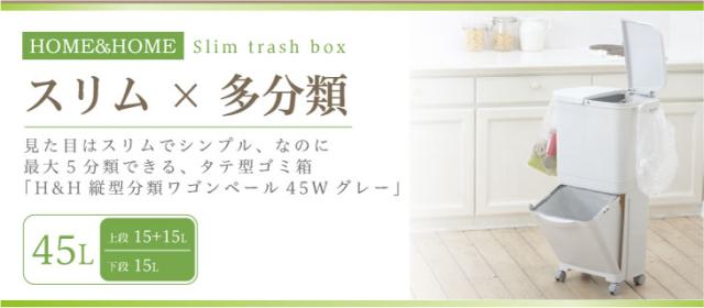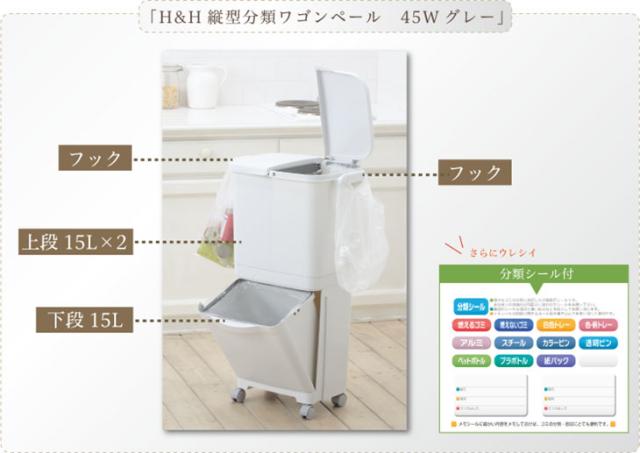 ゴミ箱 H&H縦型分類ワゴンペール 45Wグレー 【分別 ごみ箱 ダストボックス 45リットル おしゃれ ふた付き キッチン ポリ袋止め付 3分別 ワイド 45L キャスター付 移動 灰色 リス】