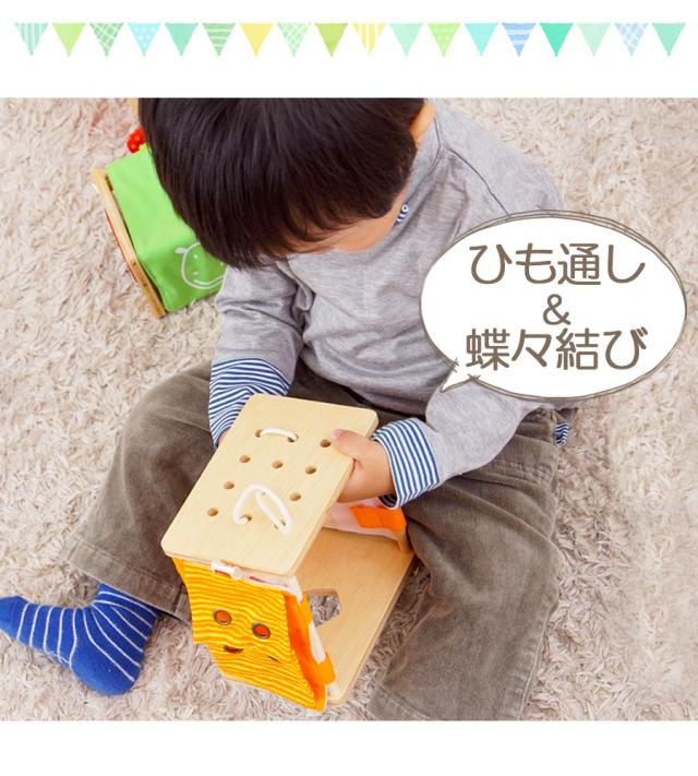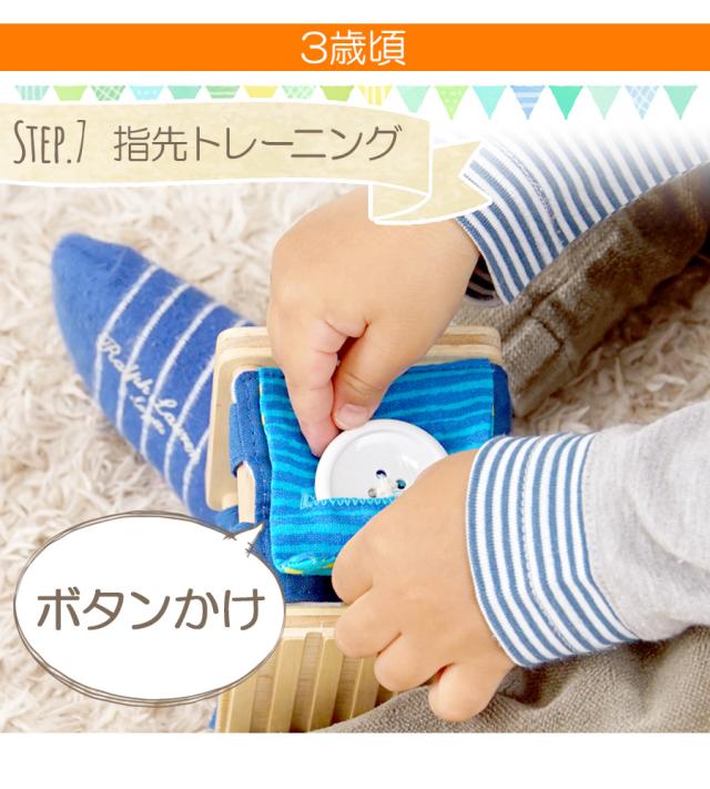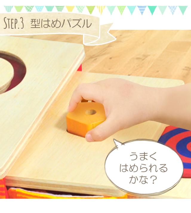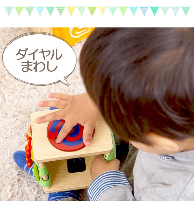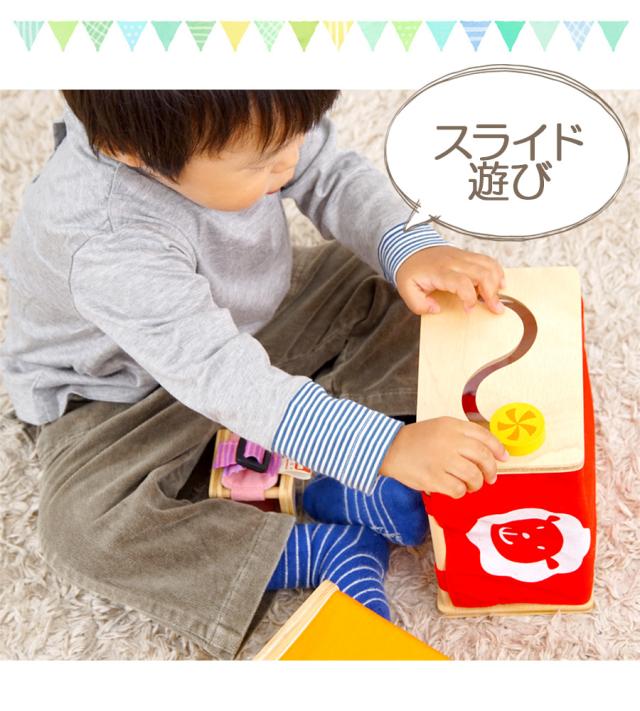 やさしい木のぬくもりと、カラフルなプリントがかわいい取り外し可能な布がついた本体には 『ボタンかけ』『ひも通し』『ベルト通し』などの知育遊びの他、カラフルな立体パズルといった機能も付いていて、 これ1つで沢山の知育遊びが楽しめます♪