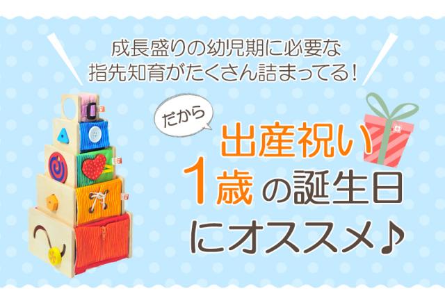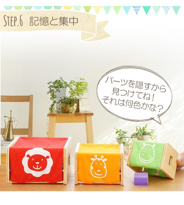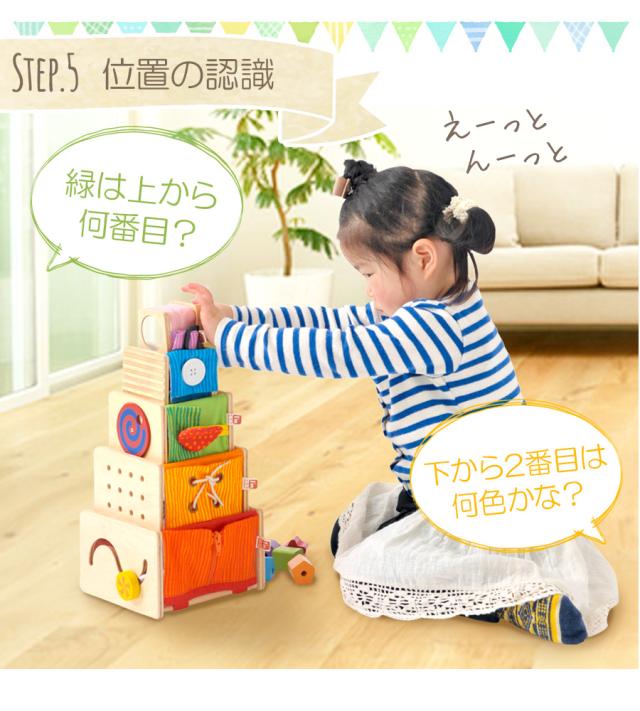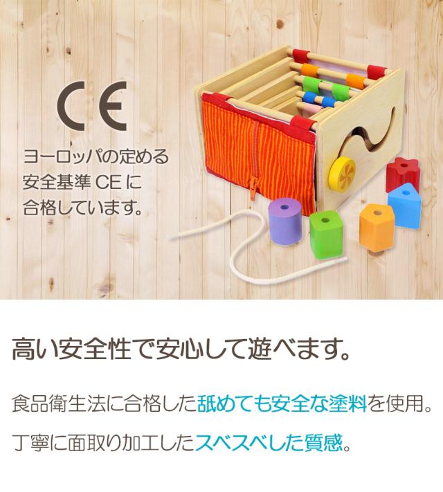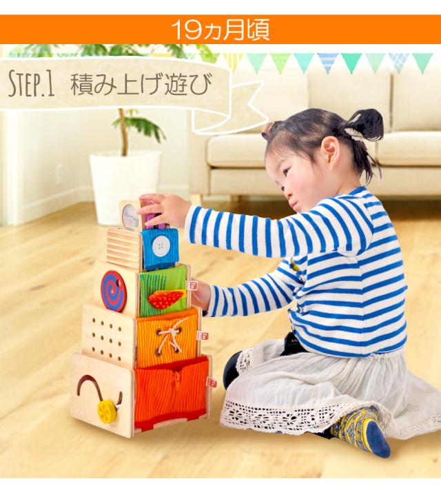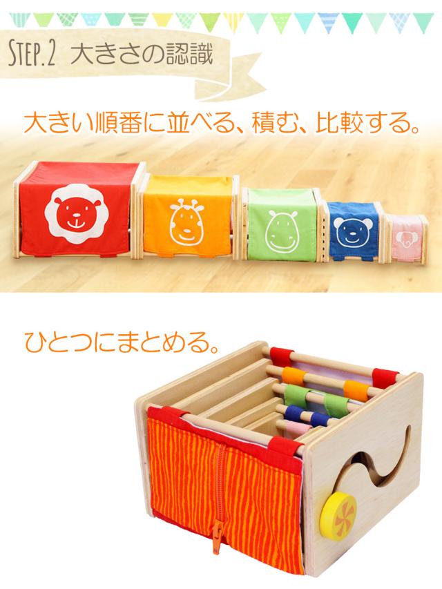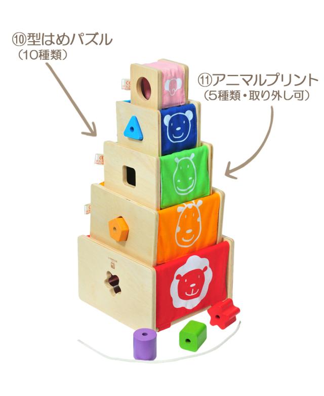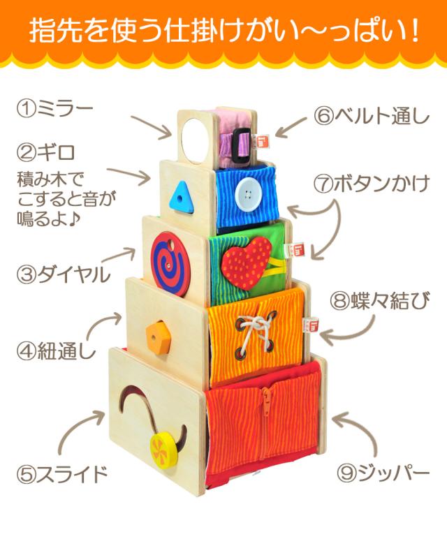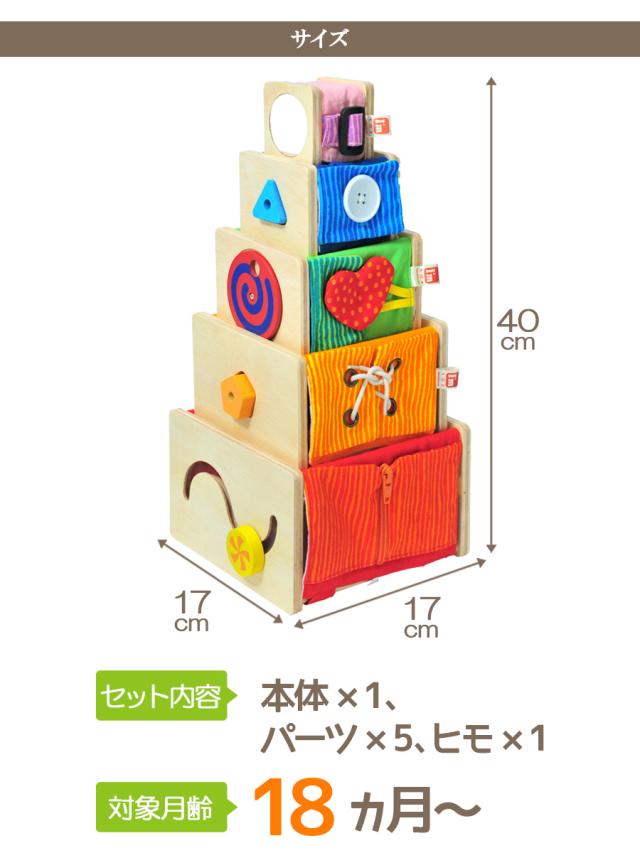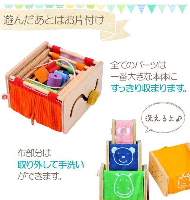 立方体な底が抜けた本体に、指先運動を促す仕掛けや、かわいい動物のプリントがついた布の面と、 立体パズルやひも通しなどの遊びの機能が付いた、木製の面の5つのスタッキングトイ。