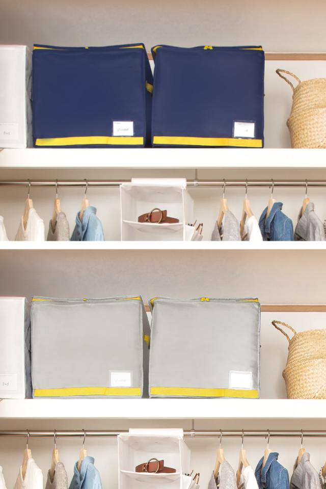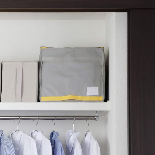 羽毛布団を約1/2の大きさに収納できる布団収納袋です。クローゼットの棚上に合わせた、奥行き約35cmです。押し入れの天袋やクローゼットの棚など、高い位置にも置きやすい設計で、限られたスペースを有効活用できます。
