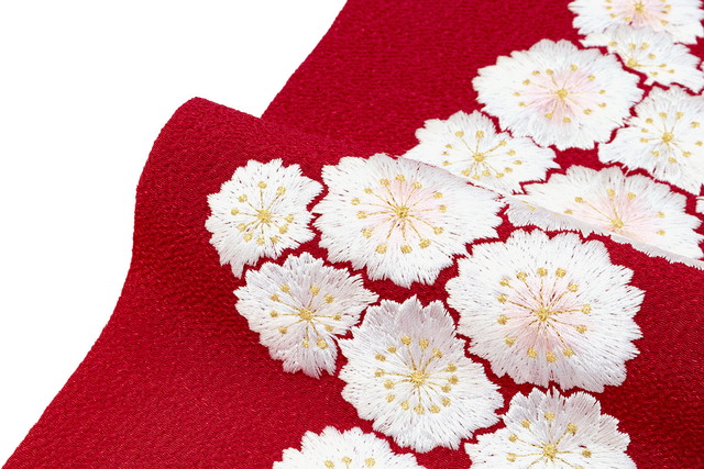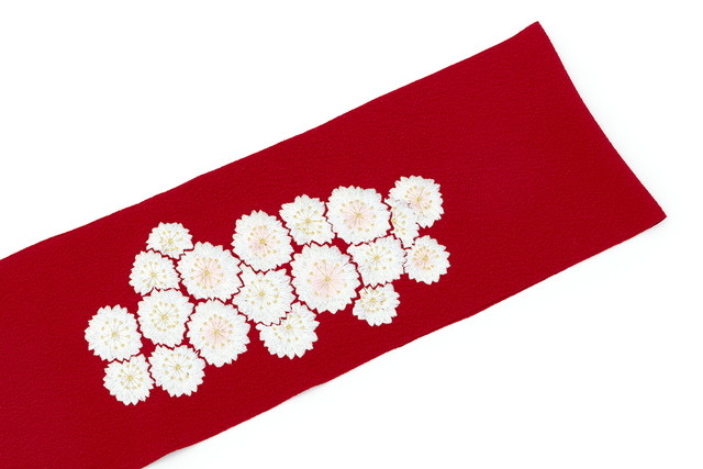 半襟 刺繍 振袖 成人式 半衿 赤 レッド 桜 さくら 花 縮緬 長め レトロ モダン 結婚式 着物 和服 和装小物 フォーマル 日本製 メール便対応
