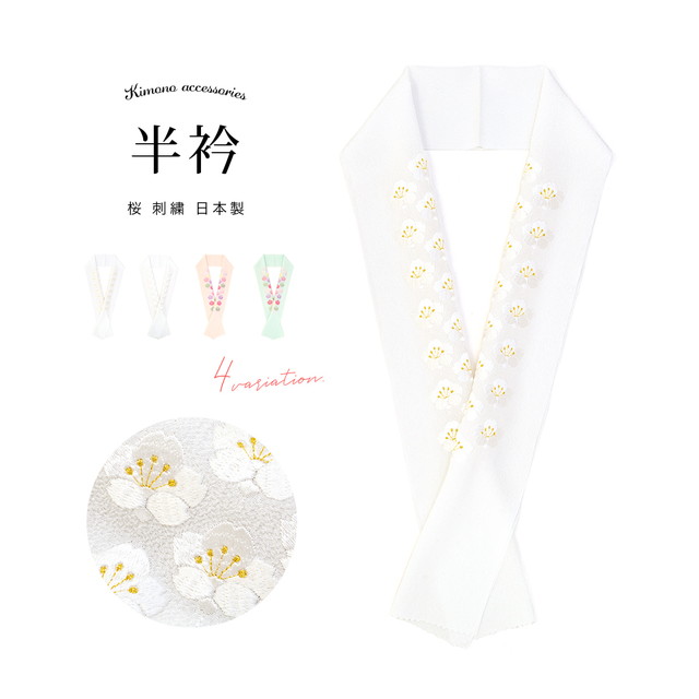 半襟 振袖 刺繍 成人式 半衿 白 ピンク 薄緑 桜 花 縮緬 ブライダルサイズ 長め 婚礼 結婚式 着物 和服 和装小物 フォーマル 日本製 メール便対応
