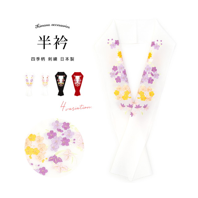 成人式 半衿 半襟 振袖 刺繍 白 黒 赤 紅葉 桜 梅 菊 菖蒲 花丸 四季 塩瀬 古典 レトロ 結婚式 着物 和服 和装小物 フォーマル 日本製 メール便対応