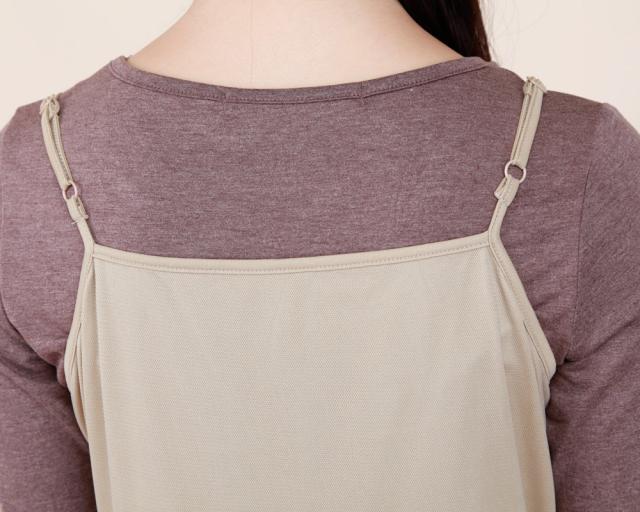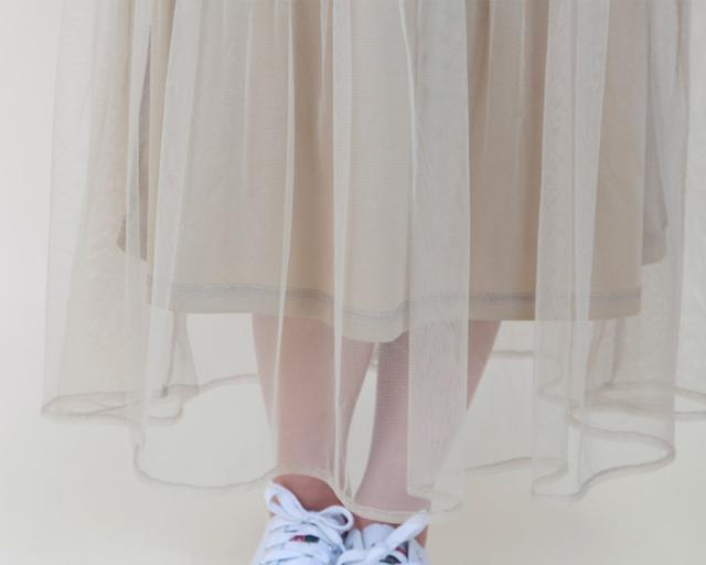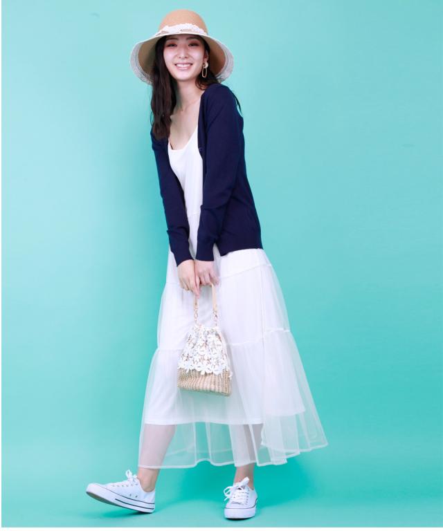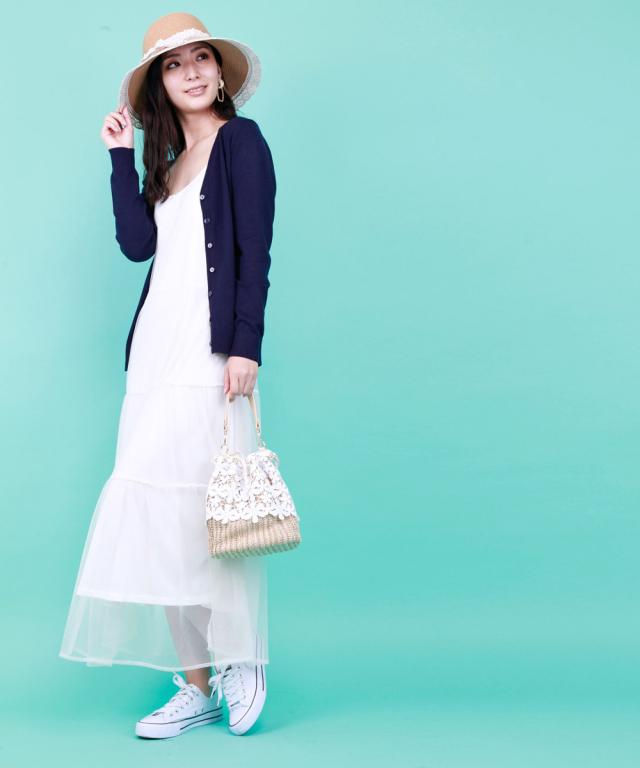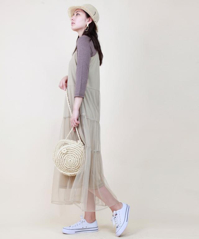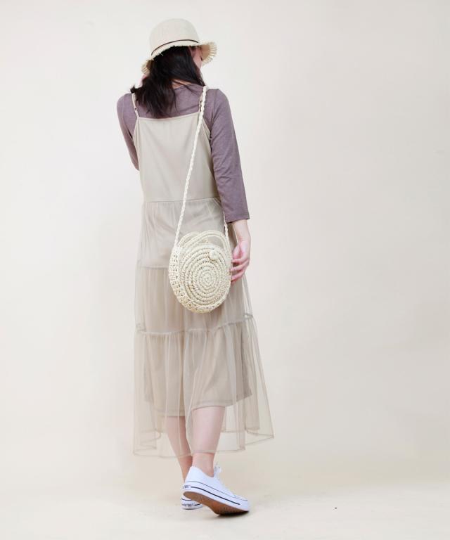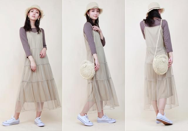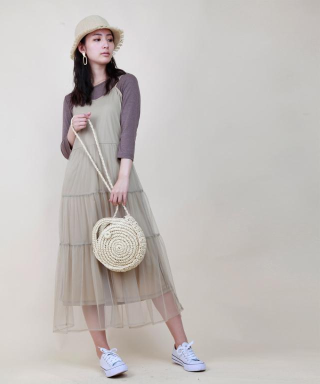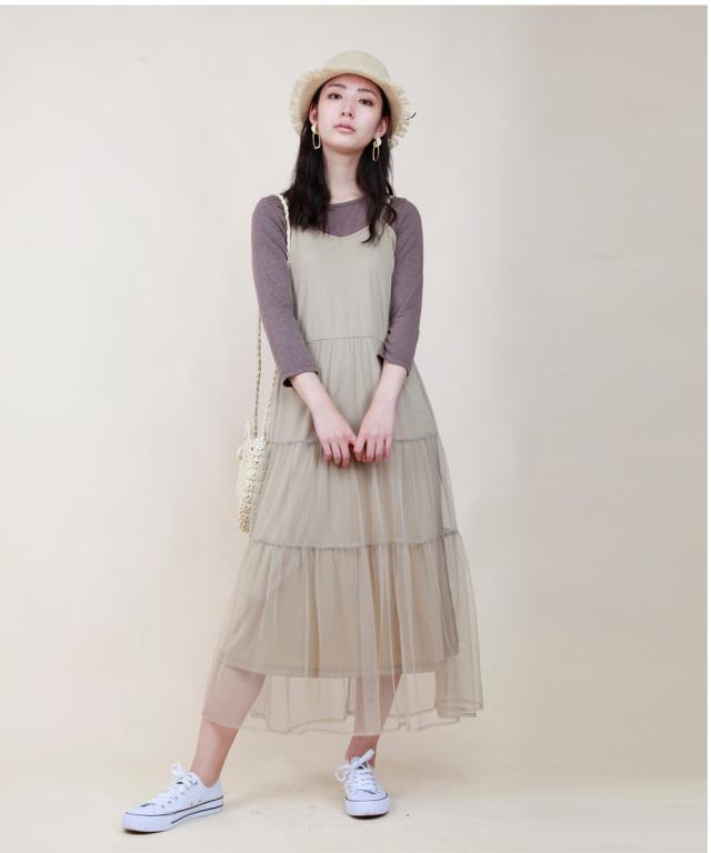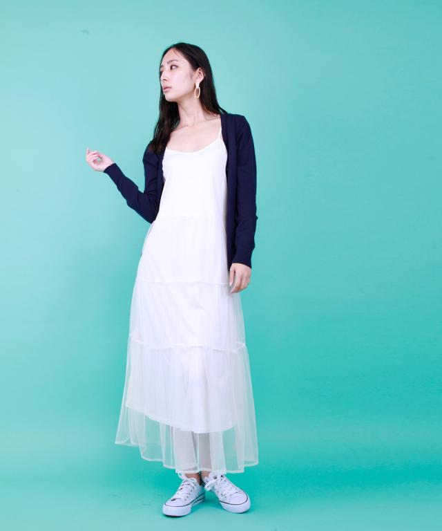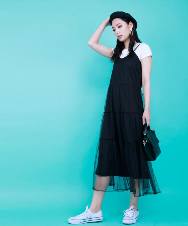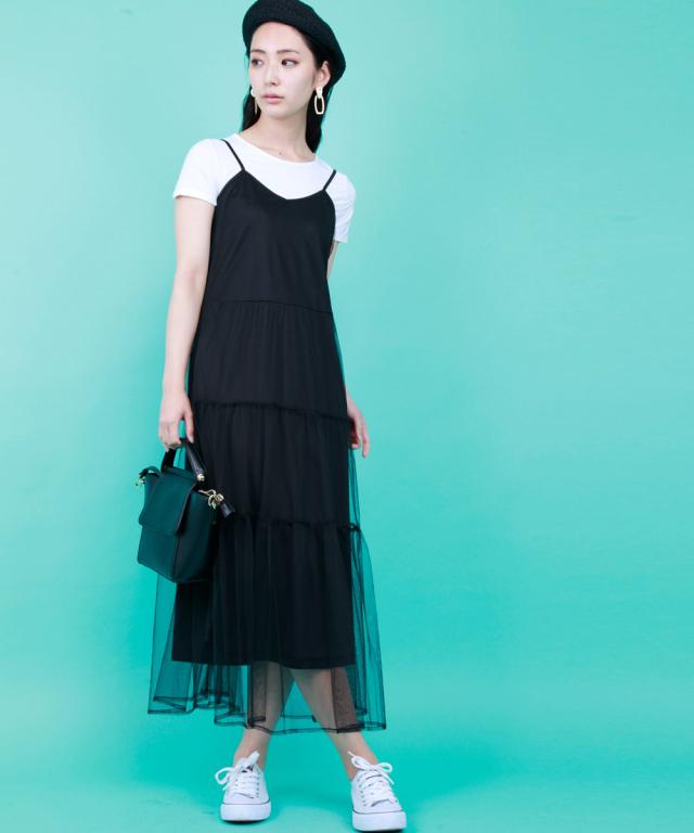 華奢なストラップやウエストから下に流れるチュールがポイント、程よい透け感で女性らしく。Tシャツやタンクトップをインナーとして着るスタイリングがオススメです。